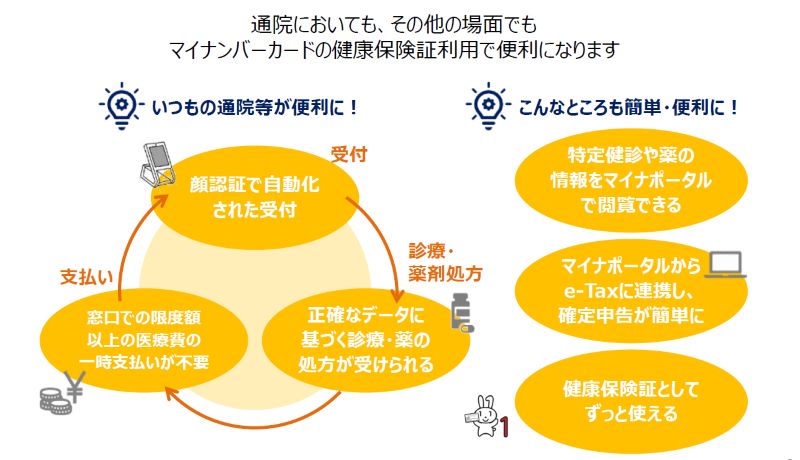 - 医療機関等で高額な医療費が発生する場合でも、マイナンバーカードを保険証として使うことで、患者さんが一時的に自己負担したり、役所で限度額適用認定証の書類申請手続きをする必要がなくなります。